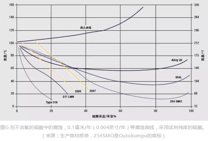 為了說明雙相不銹鋼在強酸溶液中的耐腐蝕性能,圖G給出了在硫酸溶液中的腐蝕數(shù)據(jù)。介質(zhì)條件從低酸濃度的弱還原性環(huán)境到高濃度的氧化性環(huán)境及中等濃度熱溶液的強還原性環(huán)境。