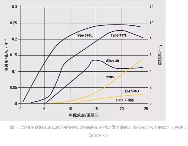 圖H顯示了在沸點溫度下,在50%醋酸和不同含量甲酸的混和溶液中雙相不銹鋼和奧氏體不銹鋼的腐蝕。盡管304和316不銹鋼可用于室溫和中等溫度下的強有機酸介質(zhì),但2205和其他雙相不銹鋼在許多涉及高溫有機酸的工藝中占優(yōu)勢,而且由于它們耐點蝕和耐應力腐蝕,也可用于鹵代烴工藝。