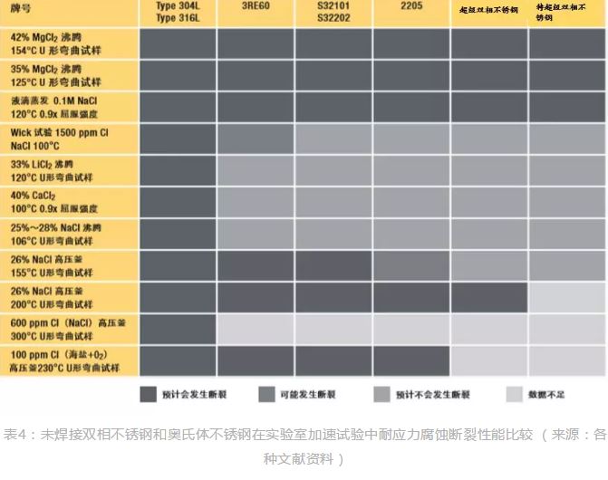 表4總結(jié)了在不同腐蝕程度的各類試驗介質(zhì)中,幾種不銹鋼的氯化物應力腐蝕斷裂行為。表的上部所列介質(zhì)由于含有酸性鹽而條件苛刻,表的下部由于溫度高而條件苛刻。表中間的介質(zhì)條件不那么苛刻。鉬含量小于4%的標準奧氏體不銹鋼在所有這些條件下均發(fā)生氯化物應力腐蝕斷裂,而雙相不銹鋼能夠耐受上述中間范圍的中等試驗條件。