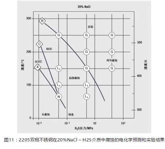 耐氫致應力腐蝕受多種因素影響,不僅與鐵素體含量有關,而且與強度、溫度、充氫條件、外加應力等有關。雙相不銹鋼盡管對氫致開裂敏感,但只要仔細評估和控制操作條件,在含氫介質(zhì)中仍可以利用其強度優(yōu)勢。這些應用中最突出的是輸送弱酸氣體和鹽水混合物的高強度管道。圖11說明了2205雙相不銹鋼在含氯化鈉的酸性介質(zhì)中不發(fā)生腐蝕和易發(fā)生腐蝕的條件范圍。