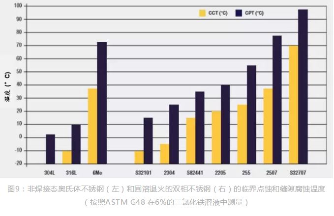 圖9給出了按照ASTM G 482(6% FeCl3)測定的固溶退火狀態(tài)下各種不銹鋼耐點蝕和縫隙腐蝕性能的比較。材料焊接狀態(tài)下的臨界溫度要低一些。臨界點蝕或縫隙腐蝕溫度越高,則表明材料耐腐蝕起始發(fā)生的能力越高。2205不銹鋼的CPT和CCT都顯著高于316不銹鋼。這使2205鋼成為用途廣泛的材料,適用于因蒸發(fā)導致氯離子濃縮的環(huán)境,例如熱交換器的蒸汽空間或保溫層的下面。2205雙相鋼的CPT還表明它可用在堿水和脫氣鹽水中。它還成功地用于脫氣海水中,在這些應用中,通過高流速的海水或用其他方法使鋼的表面沒有沉積物。在苛刻的海水應用環(huán)境中,如薄壁熱交換器管,或表面有沉積物或有縫隙時,2205不銹鋼沒有足夠的耐縫隙腐蝕能力。然而,CCT高于2205的高合金化雙相不銹鋼如超級雙相不銹鋼和特超級雙相不銹鋼,已經(jīng)用于許多既要求高強度又要求高耐氯離子腐蝕的苛刻海水條件。盡管超級雙相不銹鋼在較低溫度的海水中不發(fā)生腐蝕,但其在高溫下的應用有一定的局限性。特超級雙相不銹鋼更好的耐腐蝕性將雙相不銹鋼的應用擴展到強腐蝕性的氯離子環(huán)境如高溫熱帶的海水環(huán)境尤其是存在縫隙的場合。