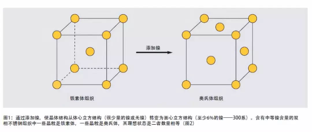 鎳是穩(wěn)定奧氏體的元素,鎳促使不銹鋼的晶體結(jié)構(gòu)從體心立方結(jié)構(gòu)(鐵素體)轉(zhuǎn)化為面心立方結(jié)構(gòu)(奧氏體)。鐵素體不銹鋼含極少的鎳或不含鎳,雙相不銹鋼含鎳量為低至中等,如1.5%~7%,300系奧氏體不銹鋼至少含有6%的鎳(見圖1、2)。添加鎳延緩了奧氏體不銹鋼中有害金屬間相的形成,但是在雙相不銹鋼中鎳的延緩作用遠不如氮有效。面心立方結(jié)構(gòu)使奧氏體不銹鋼具有極佳的韌性。雙相不銹鋼中有近一半是奧氏體組織,因此雙相鋼的韌性比鐵素體不銹鋼顯著提高。