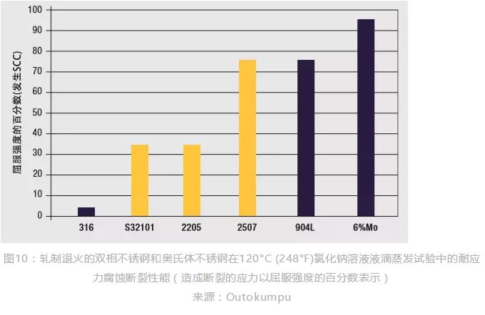 圖10給出了若干軋制退火的雙相不銹鋼和奧氏體不銹鋼在苛刻的氯化物介質(zhì)中的相對耐氯化物應力腐蝕斷裂性能。得出這些數(shù)據(jù)的液滴蒸發(fā)試驗腐蝕條件很苛刻,因為試驗溫度為120℃(248℉)的高溫,并且氯化物溶液由于蒸發(fā)而濃縮。試驗中三種雙相不銹鋼UNS S32101、2205和2507最終在所受應力達到其屈服強度的某一百分比時發(fā)生斷裂,但這一百分數(shù)比316不銹鋼相應的百分比值高得多。由于雙相鋼在常壓下的氯化物水溶液中能夠耐應力腐蝕斷裂,例如耐保溫層下的腐蝕,所以在已知304和316不銹鋼會發(fā)生斷裂的氯化物介質(zhì)中,可以考慮使用雙相不銹鋼。