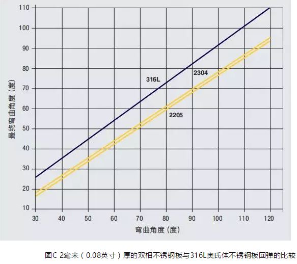 盡管雙相不銹鋼的高屈服強度允許厚度減薄,但由于彎曲和楊氏模量的限制,在制造過程中也會帶來困難。由于雙相不銹鋼強度較高,其變形需要更大的外力,因此在彎曲操作中的回彈比奧氏體不銹鋼要大,兩種雙相不銹鋼與316L奧氏體不銹鋼回彈的比較見圖C。雙相不銹鋼的延展性比奧氏體不銹鋼差,為避免斷裂需要增加彎曲半徑。