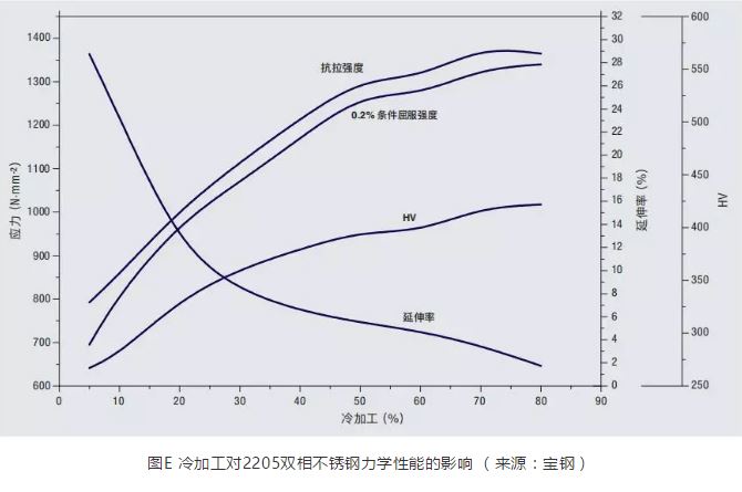 由于雙相不銹鋼較高的硬度和高加工硬化率,與標準奧氏體不銹鋼相比,它降低了機加工操作中工具的壽命或需要更多的機加工次數(shù)。在成型或彎曲操作之間可能需要退火,因為雙相不銹鋼的延展性差不多是奧氏體不銹鋼的一半。冷加工對2205雙相不銹鋼力學性能的影響見圖E。