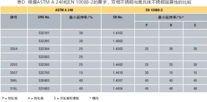 但是雙相不銹鋼的韌性和塑性通常比奧氏體不銹鋼差。奧氏體不銹鋼一般沒有塑性-脆性轉(zhuǎn)變,在低至深冷溫度的條件下仍保持優(yōu)異的韌性。表D給出了標準奧氏體不銹鋼和雙相不銹鋼在拉伸試驗中最小延伸率的比較。