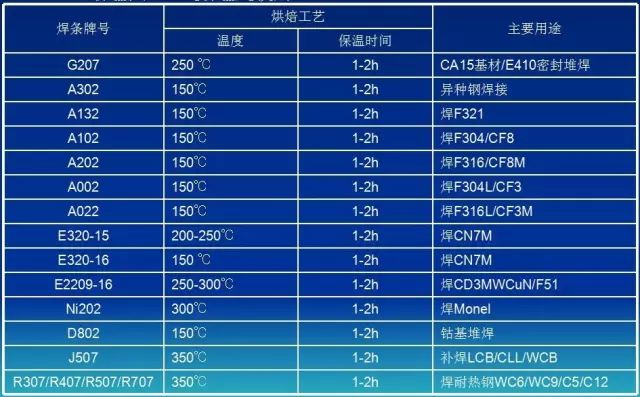 焊條在使用前需經(jīng)烘焙處理(如下表),烘焙好后的焊條需裝入保溫筒,進(jìn)行100~150℃保溫處理,邊保溫邊使用。